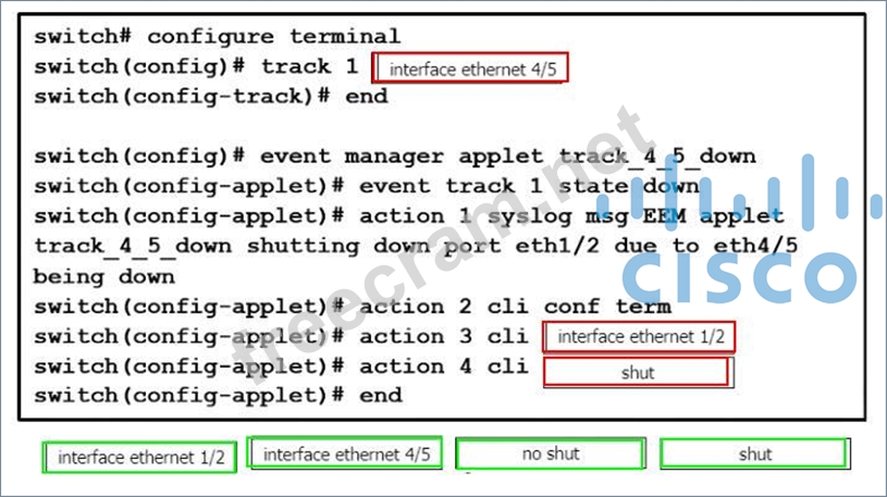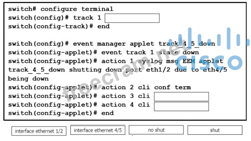 An engineer must shut down the Ethernet 1/2 interface when the Ethernet 4/5 interface state is down. Drag and drop the CLI commands from the bottom onto the blanks in the exhibit to implement this EEM. Not all commands are used.