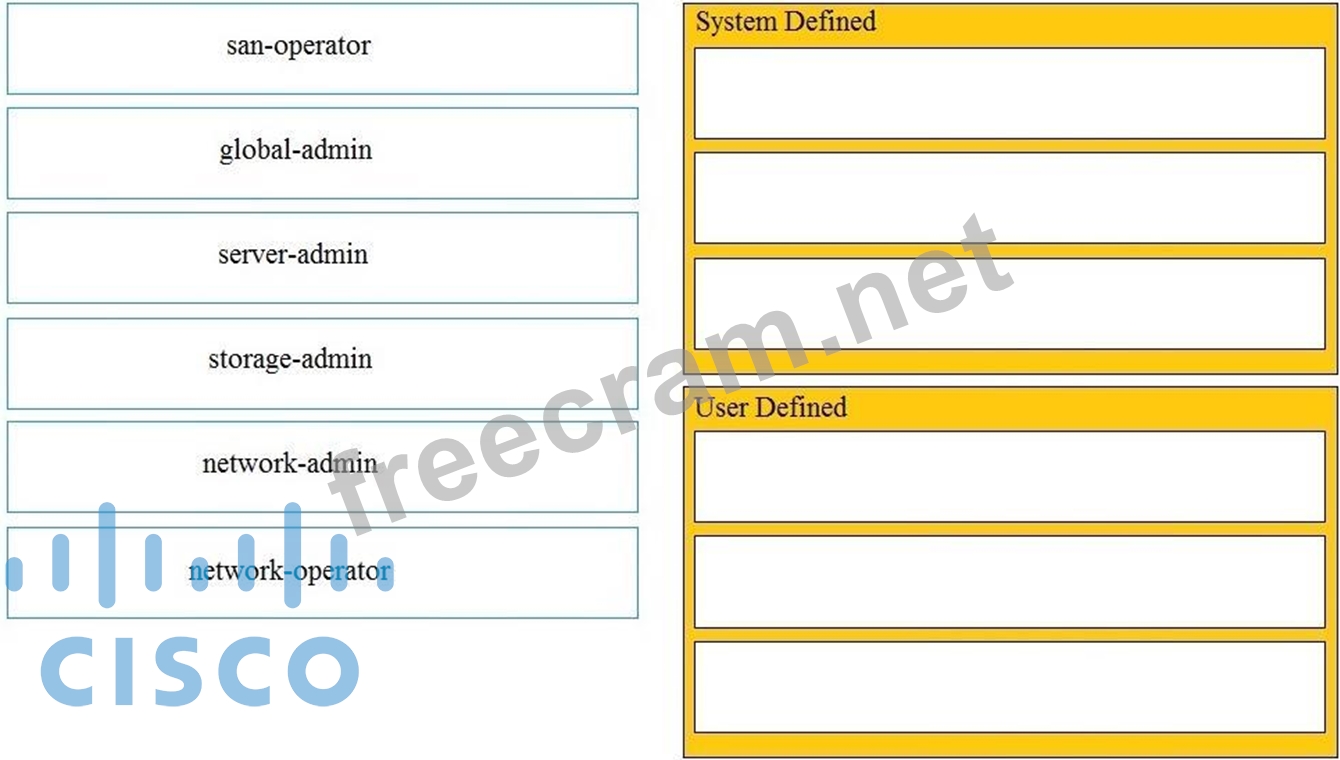 A network engineer must implement RBAC on Cisco MDS 9000 Series Multilayer Switches. Drag and drop the Cisco MDS 9000 Series roles from the left onto the correct categories on the right.