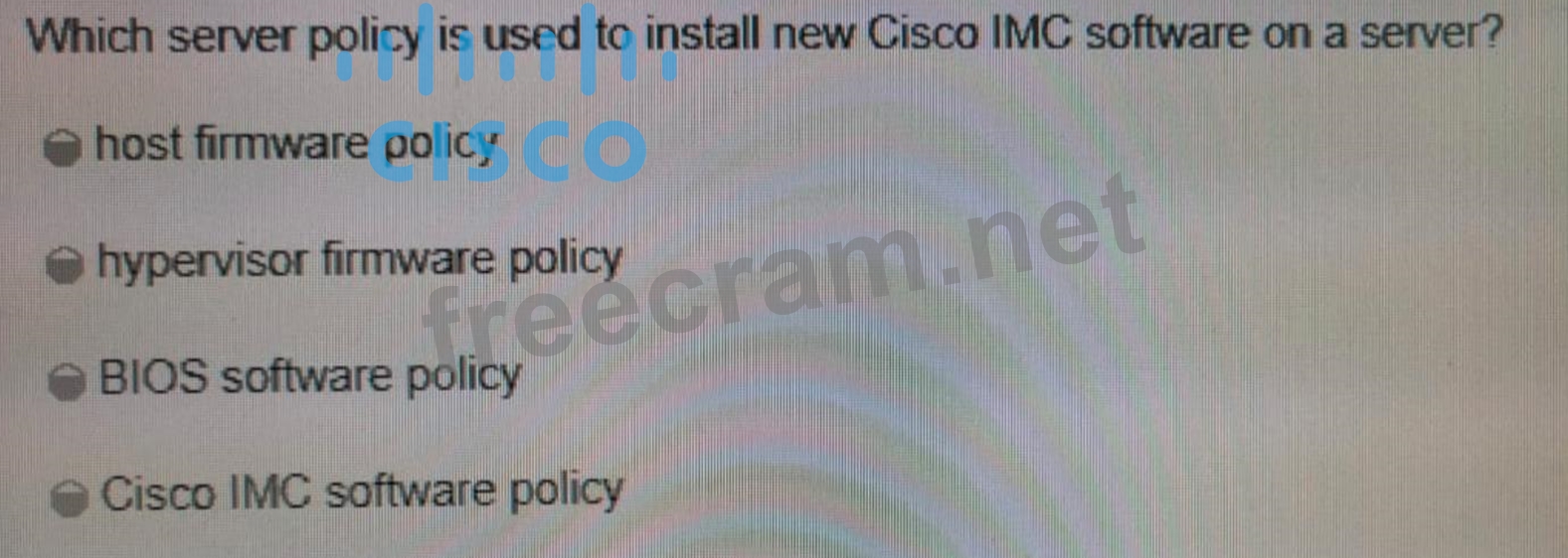 Question 36: Which server policy is used to install new Cisco IMC softwar...