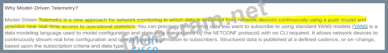 A network architect wants to propose a scalable network monitoring solution in which data is repeatedly acquired from network devices. The solution must use a push model and provide close to realtime access to operational data. Which technology must be used to meet these requirements?