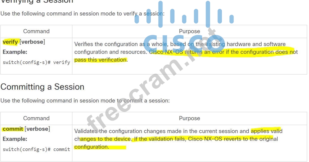 An engineer performs a set of configuration changes for the vPC domain using Session Manager. Which two commands are used to verify the configuration and apply the device changes when no errors are returned?