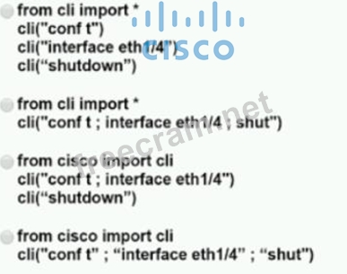 An engineer must use the python module in the guest shell of the Cisco Nexus 9000 Series switch to shutdown port Ethernet 1/4 Which command set will accomplish this?