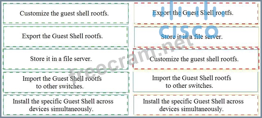 An engineer deploys a custom guest shell rootfs onto multiple switches. Drag and drop the steps from the left into the correct order on the right.