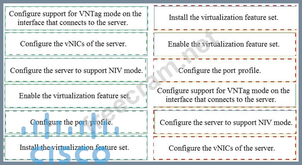 An engineer is configuring VNTag between a virtualized server and a Cisco Nexus 5500 Series switch. Drag and drop the configuration steps from the into the correct order on the right.