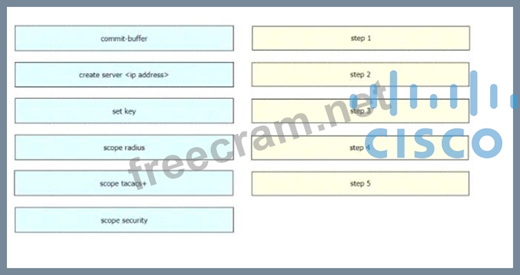 An engineer must configure remote authentication on a Cisco UCS system. The user password must be encrypted before it is sent to the authentication server. The company security policy requires the server to be based on an open standard. Drag and drop the UCS CLI AAA configuration commands from the left into the order in which they must be implemented on the right. Not all commands are used.