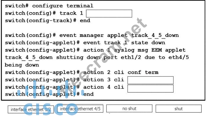 An engineer must shut down the Ethernet 1/2 interface when the Ethernet 4/5 interface state is down. Drag and drop the CLI commands from the bottom onto the blanks in the exhibit to implement this EEM. Not all commands are used.
