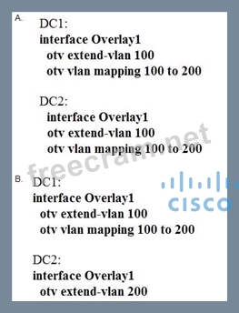 Host 1 is in VLAN 100 located is DataCenter 1 and Host2 is in VLAN200 located in DataCenter2. Which OTV VLAN mapping configuration allows Layer 2 connectivity between these two hosts?