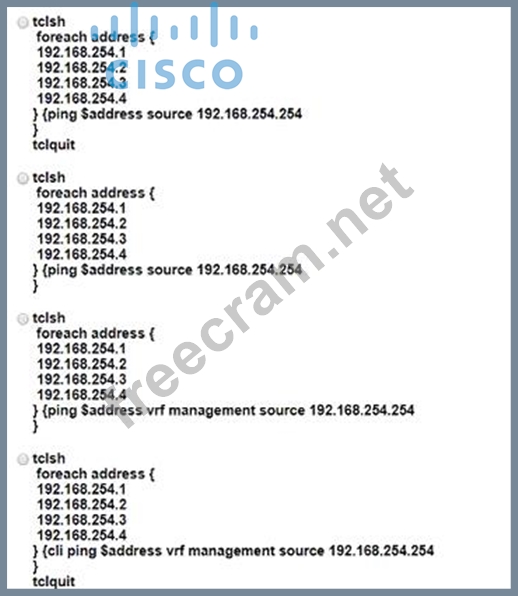 A network engineer must create a script to quickly verify IP reachability for multiple hosts using ping from the Cisco NX-OS switches. The script should use the management VRF and exit the shell after execution Which script should be used to achieve this objective?