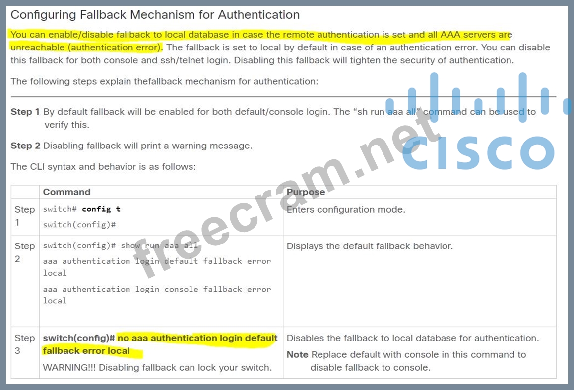 A network engineer requires remote access via SSH to a Cisco MDS 9000 Series Switch. The solution must support secure access using the local user database when the RADIUS servers are unreachable from the switches. Which command meets these requirements?