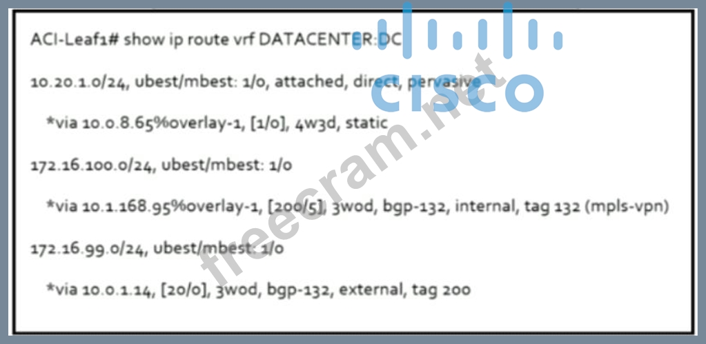 Which two statements describe the routing table of the leaf switch? (Choose two.)