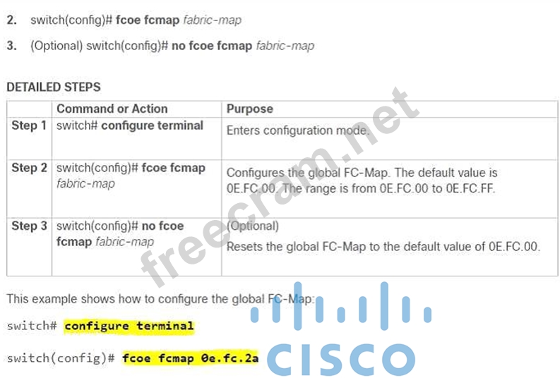 https://www.cisco.com/c/en/us/td/docs/switches/datacenter/nexus5000/sw/fcoe/ b_Cisco_Nexus_5000_Series_NX-OS_Fibre_Channel_over_Ethernet_Configuration_Guide_/ Cisco_Nexus_5000_Series_NX-OS_Fibre_Channel_over_Ethernet_Configuration_Guide__chapter3.html You can prevent data corruption due to cross-fabric talk by configuring an FC-Map that identifies the Fibre Channel fabric for this Cisco Nexus device. When the FC-Map is configured, the switch discards the MAC addresses that are not part of the current fabric.