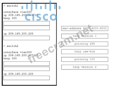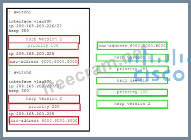 Drag and drop the commands from the right to complete a configuration of the HSRP on the left. The commands are used more than once. Not all commands are used.