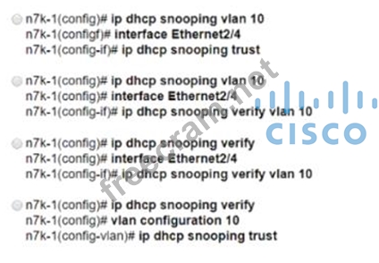 An engineer must implement a solution that prevents untrusted DHCP servers from compromising the network. The feature must be configured on a Cisco Nexus 7000 Series Switch and applied to VLAN 10. The legitimate DHCP servers are connected to interface Ethernet 2/4. Which configuration set must be used to meet these requirements?