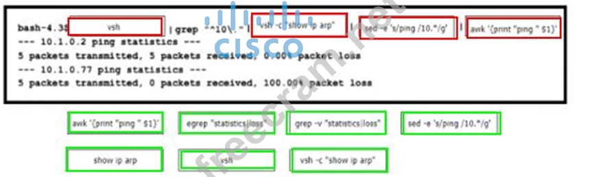 A network administrator must automate the process of pinging all the IP addresses from the 10.0.0.0/8 subnet. The subnet is already present in the ARP table of the Cisco Nexus switch. Drag and drop the bash commands to generate the desired output. Not all commands are used.