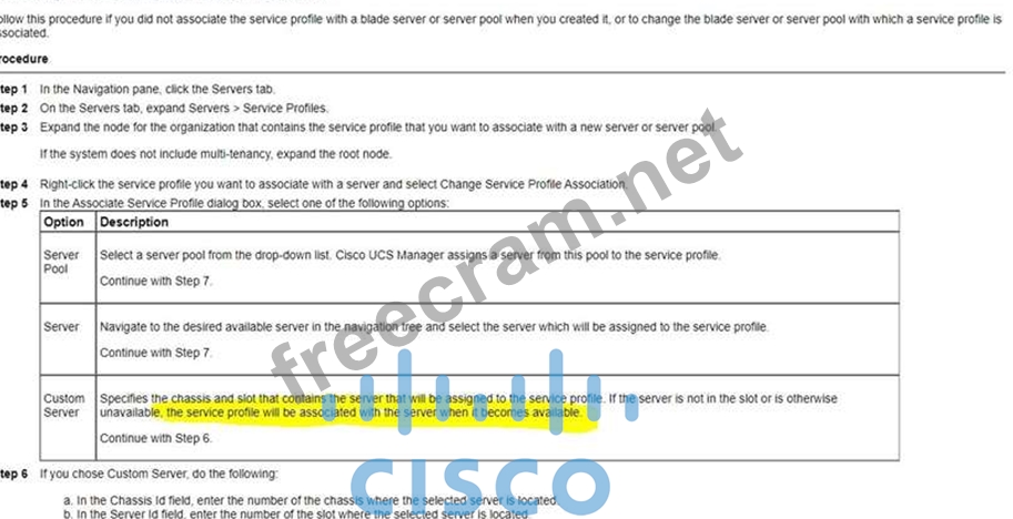 A UCS B- Series server located in B5108 chassis 1 slot 1 is currently unavailable. The server needs to be associated with a specific service profile when it becomes available. Which associate service profile option should be selected to accomplish this goal?