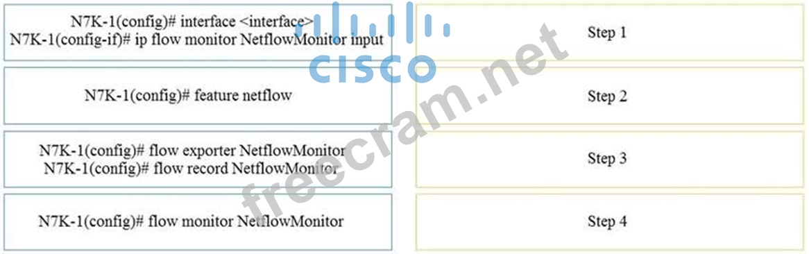 An engineer is implementing NetFlow on a Cisco Nexus 7000 Series Switch. Drag and drop the NetFlow commands from the left into the correct order they must be entered on the right.