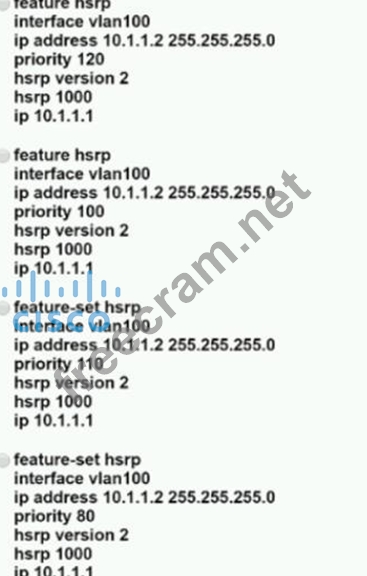 An engineer must configure a Nexus 7000 series switch for HSRP on VLAN 100. When fully functional, the router must be the active master. Which set of commands must be used to implement the scenario?