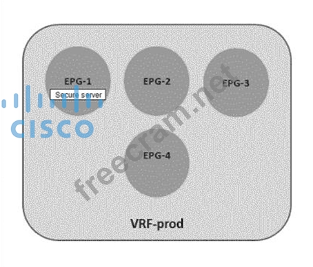 Refer to the exhibit. A secure server that provides services to EPG-2 must be placed in EPG-1. The remaining EPGs-EPG-2, EPG-3. and EPG-4-must communicate without any contracts. Which set of actions accomplishes this goal?