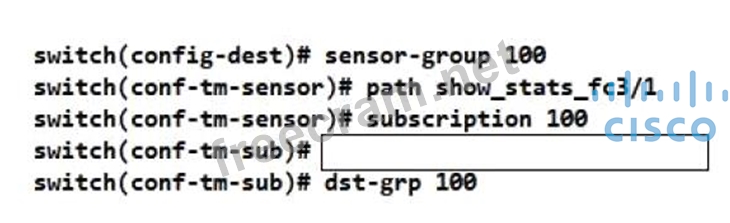 Refer to the exhibit. Refer to the exhibit. An engineer needs to implement streaming telemetry on a cisco MDS 9000 series switch. The requirement is for the show command data to be collected every 30 seconds and sent to receivers. Which command must be added to the configuration meet this requirement?