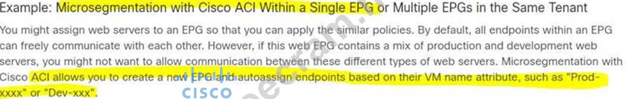 Several production and development database servers exist in the same EPG and IP subnet. The IT security policy is to prevent connections between production and development. Which attribute must be used to assign the servers to different microsegments?