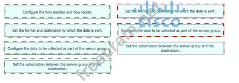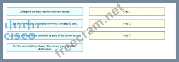 A network engineer must implement a telemetry solution to collect real-time structured data in a large-scale network. Drag and drop the actions from the left into the order on the right to implement the solution. Not all actions are used.