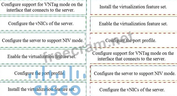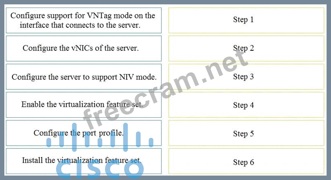 An engineer is configuring VNTag between a virtualized server and a Cisco Nexus 5500 Series switch. Drag and drop the configuration steps from the into the correct order on the right.