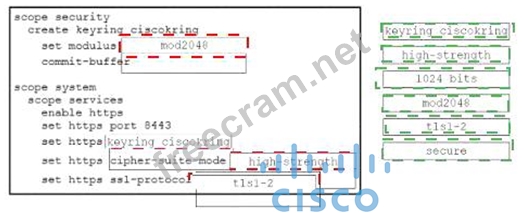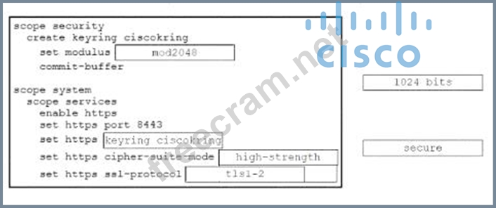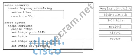 An engineer must configure Cisco UCS Manager to accept only HTTPS connections that use TLS 1 2 The cipher security level must be high and the length of the keyring key value must be 2048 bits Drag and drop the code snippets from the right onto the blanks in the code on the left to accomplish these goals Not all commands are used