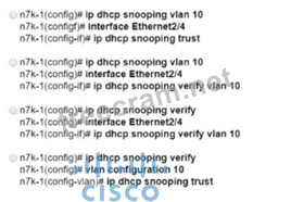 An engineer must implement a solution that prevents untrusted DHCP servers from compromising the network. The feature must be configured on a Cisco Nexus 7000 Series Switch and applied to VLAN 10. The legitimate DHCP servers are connected to interface Ethernet 2/4. Which configuration set must be used to meet these requirements?