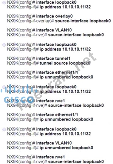 An engineer must perform an initial configuration of VXLAN Tunnel End-Point functionality on the Cisco Nexus 9000 Series platform All the necessary features are already enabled on the switch Which configuration set must be used to accomplish this goal?