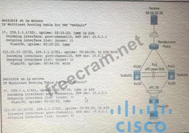 Refer to the exhibit. A host with source address 10.10.10.10. sends traffic to multicast group 239.1.1.1. how do the vPC switches forward the multicast traffic?