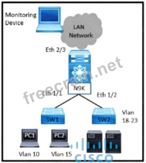 * The servers that are connected to SW2 are experiencing packet drops when they connect to the Internet The engineer wants to configure the required traffic capture to investigate the issue further Which configuration must be implemented to monitor the traffic?