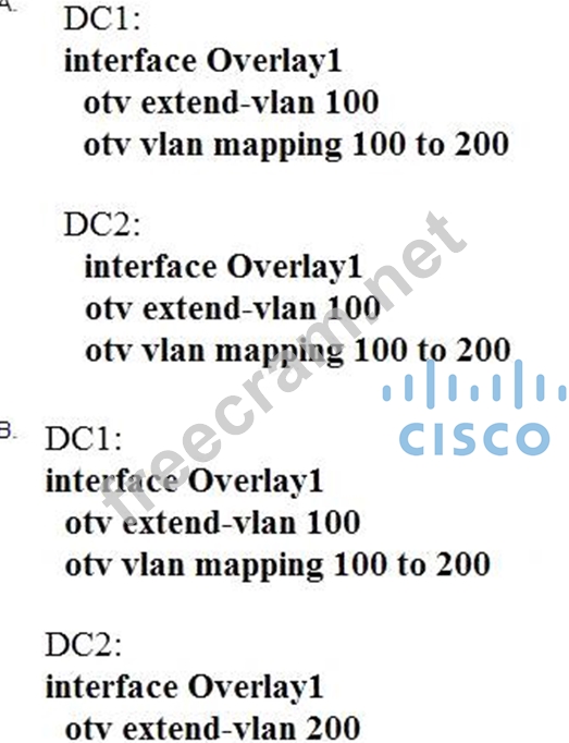 Host 1 is in VLAN 100 located is DataCenter 1 and Host2 is in VLAN200 located in DataCenter2. Which OTV VLAN mapping configuration allows Layer 2 connectivity between these two hosts?