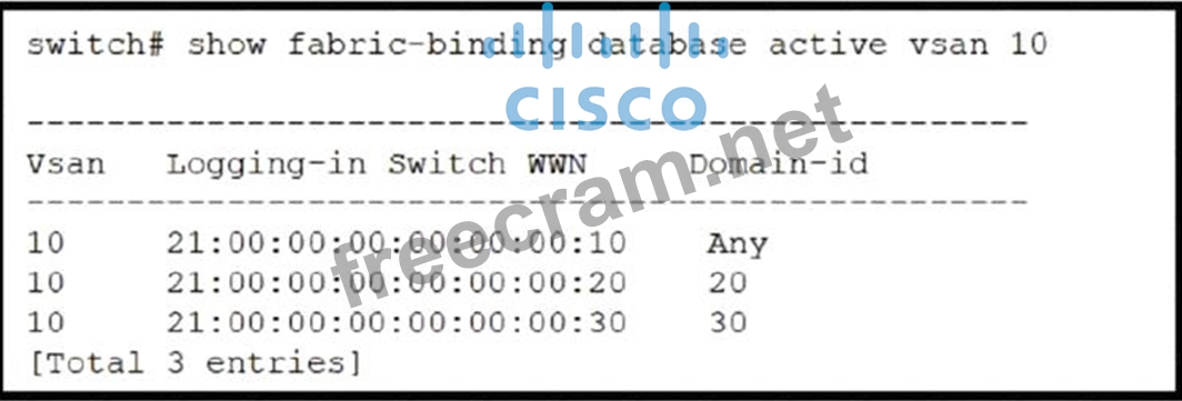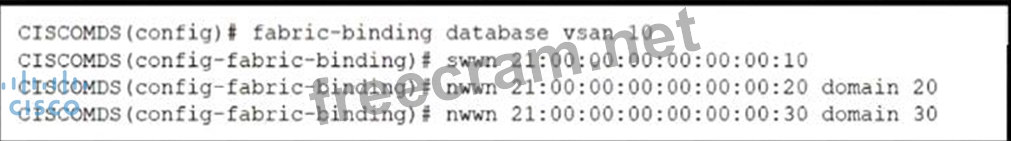 An engineer must configure fabric binding on a Cisco MDS 9000 Series Switch to match the output. Which fabric database configuration accomplishes this goal?