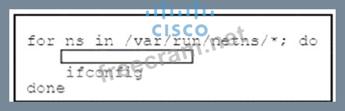An engineer must create a Bash script to run in the Cisco NX-OS Guest Shell. The script must loop through the available namespaces and output all registered interfaces. Which code snippet completes the script?
