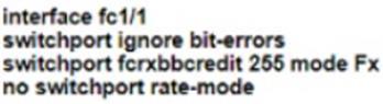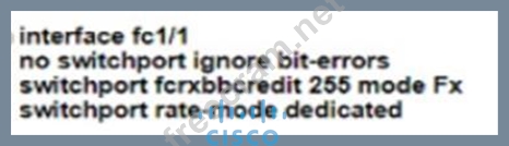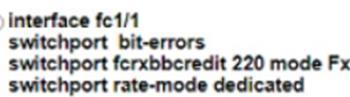 A network engineer must configure a Fibre Channel interface on the Cisco MDS 9000 Series Switch The configuration must meet these requirements * The interface must be disabled when the bit errors threshold Is exceeded * Buffer-to-buffer credits must be set to the maximum value * The interface must have full bandwidth allocated for its port group Which command set configures a Fibre Channel interface that meets these requirements?
