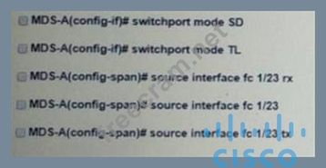 To SPAN only the ingress traffic on a Cisco MDS 9000 series switch, the configuration must include specifying the source interface for monitoring (fc 1/23) and setting it to capture only ingress traffic (rx). Option A and Option C contain the necessary commands to achieve this. References: = Detailed steps and examples for configuring SPAN to monitor ingress traffic on Cisco MDS 9000 series switches can be found in the Cisco MDS 9000 Series System Management Configuration Guide