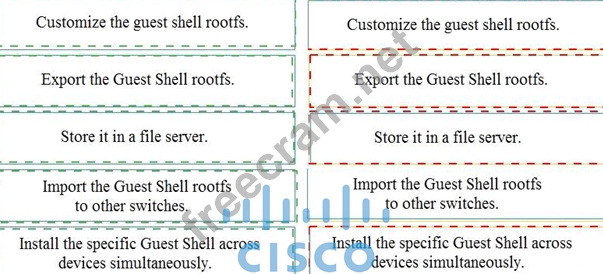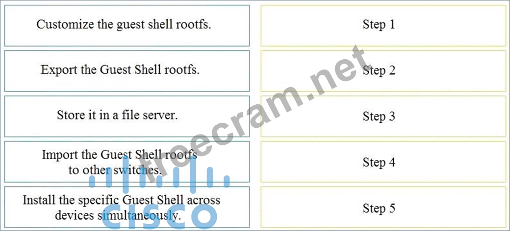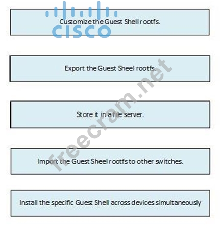 An engineer deploys a custom Guest Shell rootfs on a Nexus 9000 Series Switch. Drag and drop the steps from the left into the order required to deploy the solution on the right. Not all options are used.