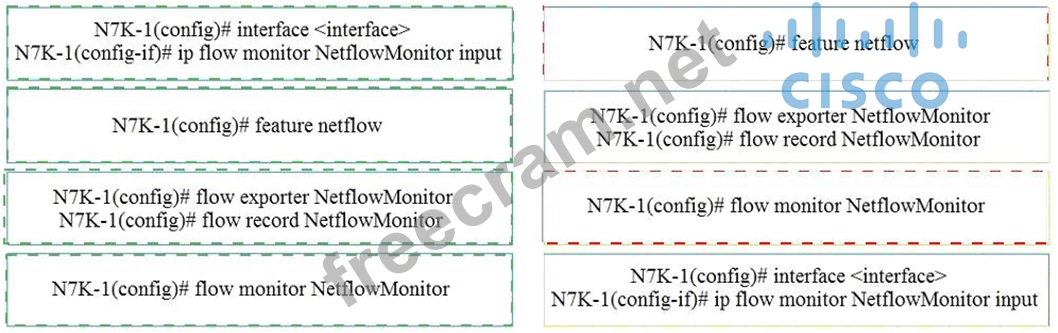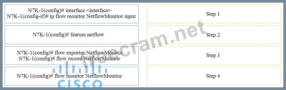 An engineer is implementing NetFlow on a Cisco Nexus 7000 Series Switch. Drag and drop the NetFlow commands from the left into the correct order they must be entered on the right.