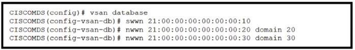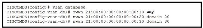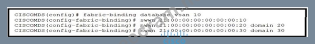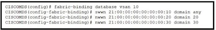 The correct answer is option C. The fabric binding configuration in option C matches the output required for the Cisco MDS 9000 Series Switch. Fabric binding enhances the security of the SAN fabric by allowing only authorized switches to join the fabric. The configuration includes specifying the switch world wide name (swwn), domain ID, and member world wide node name (nwwn) to ensure that only the specified devices can participate in the fabric. References: For more information on fabric binding and its configuration, you can refer to the Cisco MDS 9000 Series Fabric Switches Configuration Guide and the Implementing and Operating Cisco Data Center Core Technologies (DCCOR) study materials.