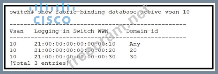 Refer to the exhibit. An engineer must configure fabric binding on a Cisco MDS 9000 Series Switch to match the output. Which fabric database configuration accomplishes this goal?