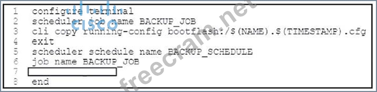 The Cisco NX-OS scheduler must run every day at 3:00 a.m. Which code snippet completes the script?
