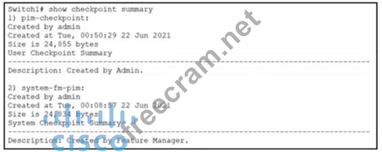 The command rollback running-config checkpoint system-fm-pim-best-effort is used to restore the configuration changes made by disabling the PIM feature and skipping any errors. In Cisco Data Center Core Technologies, it's essential to understand that rollback is a feature that allows administrators to take a snapshot of the configuration before making changes, so they can quickly roll back if needed. The system-fm-pim-best-effort option ensures that the rollback occurs even if there are errors encountered during the process, ensuring that as much of the previous state is restored as possible. References: * Cisco Nexus: Configuration Rollback Overview and Guidelines1. * IP Multicast: PIM Configuration Guide