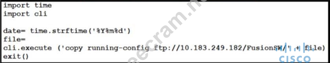 The correct command to add to the script is option B, which concatenates the string 'fusion-config_' with the variable date to form the filename. This will result in a filename that includes the desired prefix followed by the current date, matching the format specified in the question. References := For more information on scripting and automation within Cisco environments, you can refer to the Cisco Data Center Core Technologies documentation, which includes guidelines on using Python scripts for network configuration and management tasks.