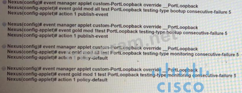 The configuration that applies the changes for module 1 only, setting the Generic Online Diagnostics policy for a PortLoopback test to error disable the port after 5 consecutive failures, would be Option C based on the provided options. https://www.cisco.com/c/en/us/td/docs/switches/datacenter/nexus7000/sw/system-management/guide/ b_Cisco_Nexus_7000_Series_NX-OS_System_Management_Configuration_Guide-RI/ configuring_online_diagnostics.html https://www.cisco.com/c/en/us/td/docs/switches/datacenter/nexus9000/sw/93x/system-management/bcisco- nexus-9000-series-nx-os-system-management-configuration-guide-93x/b-cisco-nexus-9000-seriesnx- os-system-management-configuration-guide-93x_chapter_011010.html https://www.ciscolive.com/c/dam/r/ciscolive/us/docs/2017/pdf/BRKDCN-3234.pdf