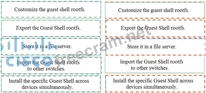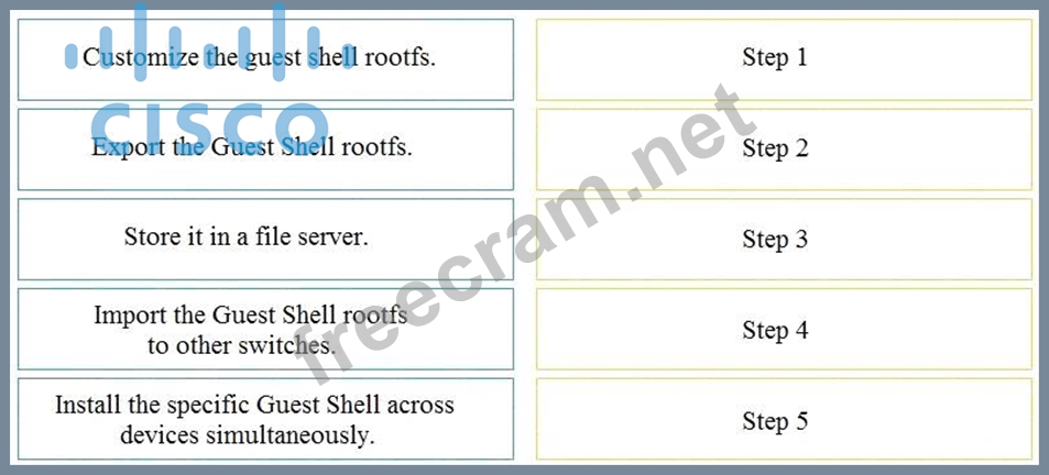 An engineer deploys a custom Guest Shell rootfs on a Nexus 9000 Series Switch. Drag and drop the steps from the left into the order required to deploy the solution on the right. Not all options are used.