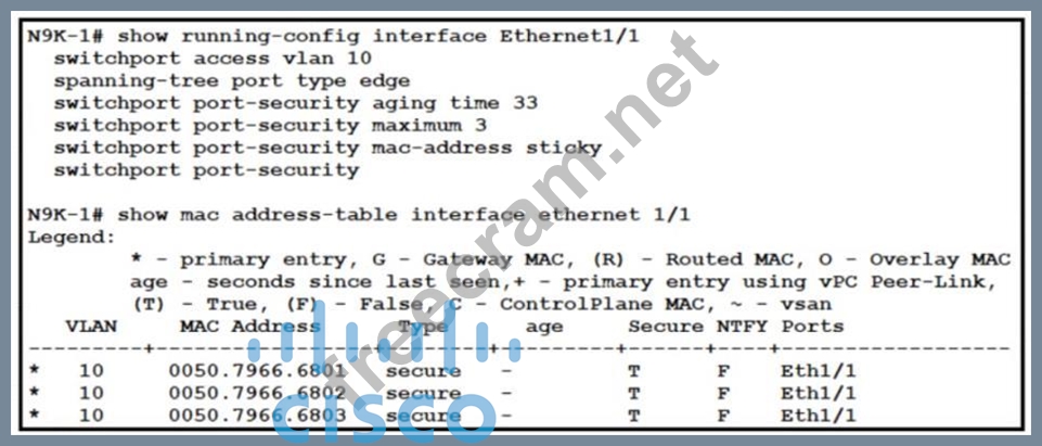 Refer to the exhibit. An engineer configures port security on a Cisco Nexus 9000 Series Switch. The requirement is to prevent any newly learned MAC addresses from forwarding traffic on the interface. Also, the already learned MAC addresses must not be affected by the changes. Which configuration meets these requirements?