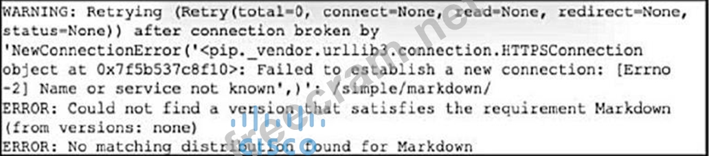 To install the "Markdown" package from the Python package manager on a Cisco Nexus 93108 Series Switch, the engineer must ensure that the guest shell has internet access to reach the Python package repository. This is achieved by adding the nameserver configuration to /etc/resolv.conf, which allows the system to resolve domain names into IP addresses. After configuring the nameserver, the engineer must run the command sudo chvrf management pip install Markdown to install the package within the management Virtual Routing and Forwarding (VRF) context, which has access to the internet. References: = For more information on managing packages in the guest shell of Cisco Nexus switches, refer to the Cisco Nexus 9000 Series NX-OS Programmability Guide.