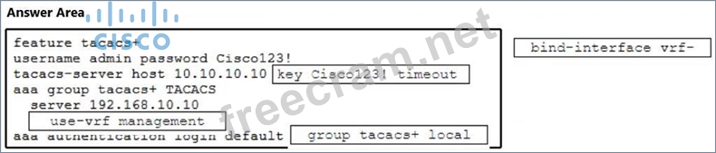 All logins to a Cisco Nexus 9000 Series Switch must pass through the TACACS+ server at IP address 192.168.10.10. The configuration must meet these requirements: