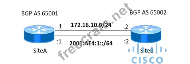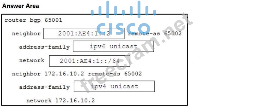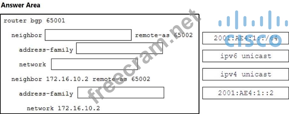 Refer to the exhibit. An administrator is deploying BGP to geographically connect two data center sites. Both sites are configured for dual-stack routed protocols. The administrator must inject the IPv6 network 2001:AE4:1::/64 into the IPv6 unicast database. Drag and drop the SiteA commands from the right into the blanks in the configuration on the left. Commands are used more than once.