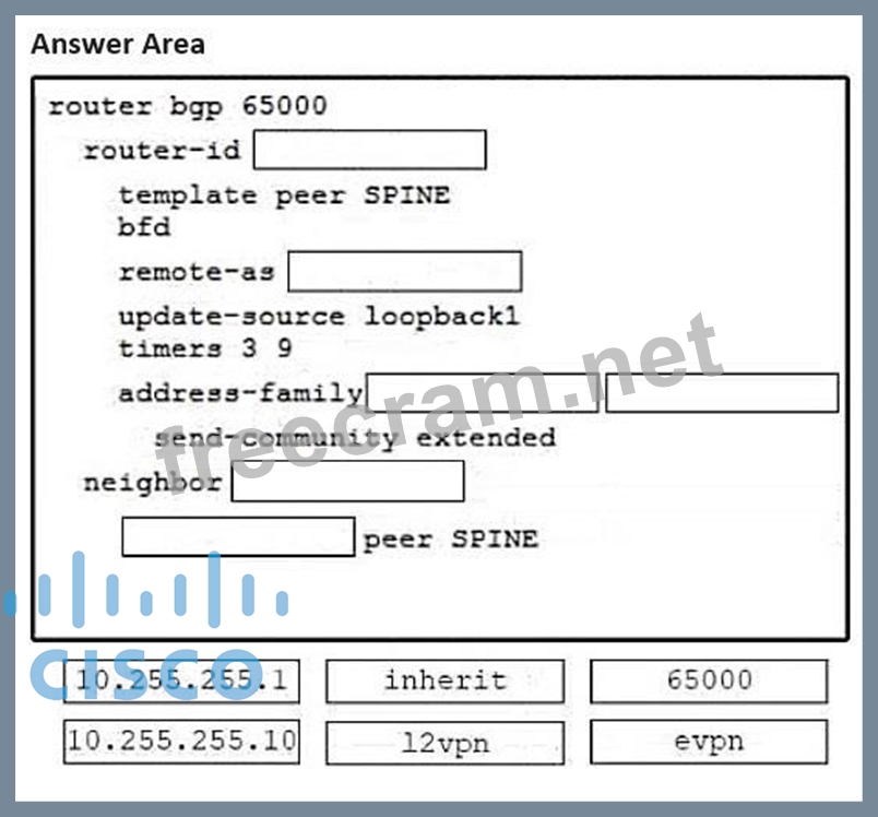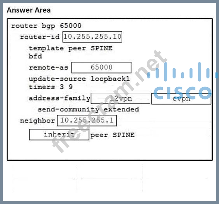 Refer to the exhibit. An engineer must provision a VXLAN deployment. The OSPF has already been configured as the underlay protocol. All BGP configurations will be performed using the template method. The deployment must meet these requirements: